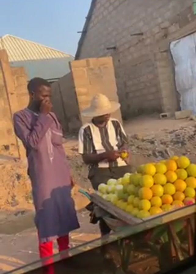 two men standing next to a cart full of oranges and lemons on a sunny day in an outdoor, urban-like environment. One man is wearing a long-sleeved purple shirt and red pants, while the other wears a black and white striped shirt, black pants, and a straw hat. The man with the straw hat is peeling an orange. Both men are standing beside the cart, which is piled high with fruit. In the background, there are buildings constructed from bricks or cinderblocks. The scene is being recorded from inside a vehicle, as suggested by the visible interior of the car window in the foreground.