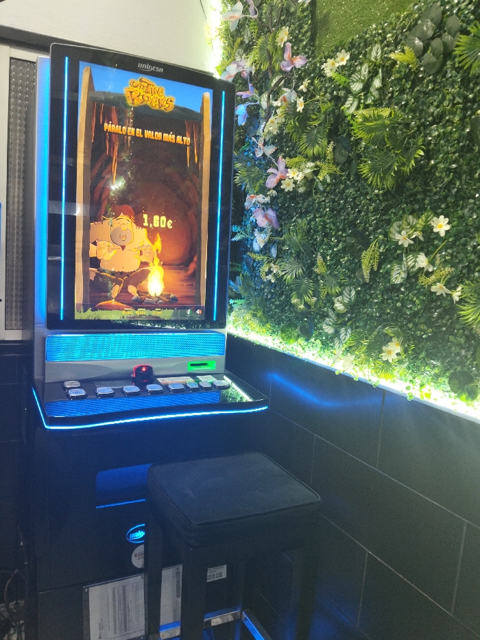A slot machine with a stool placed in front of it. The machine's screen displays a cartoon character with a campfire, set against a cave backdrop. Text in Spanish is visible at the top of the screen. The machine is illuminated with blue neon lighting. A decorative wall of artificial plants and flowers is to the right of the machine. The background consists of a dark tiled wall.