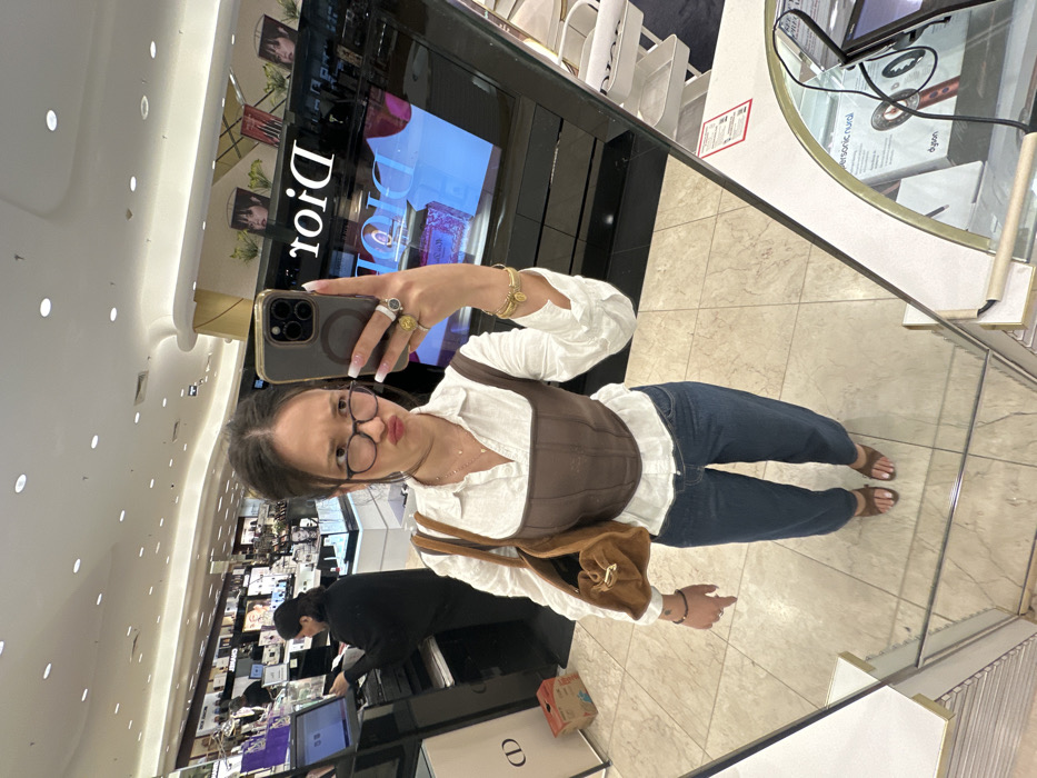 A young woman is depicted in a full-body mirror selfie within a luxury department store's beauty section in Las Vegas, United States. The primary subject, visible from head to feet in the reflection, has dark hair pulled back and wears round-frame glasses. She is dressed in a white long-sleeved collared shirt, a brown corset-style top, dark blue jeans, and brown open-toe sandals. A brown shoulder bag hangs from her left shoulder. She holds a gold-colored smartphone (likely an iPhone with a three-camera system) in her right hand, capturing her reflection, and is making a puckered-lip facial expression. She wears multiple rings on her right hand and a gold bracelet on her right wrist. Her nails feature a white ombre design. In the immediate background, a prominent "Dior" beauty counter is visible, characterized by sleek, reflective black surfaces and large white lettering. Images of a person's face are displayed on screens or posters above the "Dior" branding. To the far left, partially obscured, a person in a dark garment stands at a sales counter, appearing to operate a computer terminal. The environment features bright, artificial overhead lighting, light-colored tiled flooring, and modern retail display units. A "CD" (Christian Dior) box is partially visible on a lower shelf, and a Dyson Airwrap display is reflected in the mirror's lower right corner. The scene is consistent with a high-end department store beauty area, such as those found in Las Vegas malls like Fashion Show Mall or The Forum Shops at Caesars.