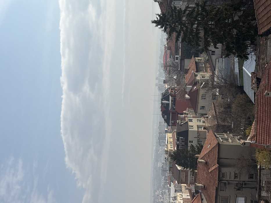 This image depicts an elevated, panoramic view of a residential and urban area within Shumen, Bulgaria, under a partially cloudy sky with atmospheric haze. The upper third of the frame is occupied by a light blue sky transitioning into a lighter, hazy horizon, featuring elongated, horizontally oriented cumulus and stratocumulus cloud formations. The midground is dominated by a dense arrangement of multi-story buildings, primarily residential, characterized by varied architectural styles. Most roofs are terracotta red tiles, though some darker or metallic roofs are present. Building facades exhibit colors such as beige, off-white, and grey. Interspersed among the structures are several trees, including a prominent dark green coniferous tree positioned on the right side of the midground, and other bare deciduous trees indicating a dormant state. In the distant midground, the city expands with a cluster of taller, less distinct urban buildings, including a large white building with a curved roof and a red-roofed complex, all softened by the pervasive haze. The foreground consists mainly of the terracotta-tiled roofs of closer buildings, viewed from above, with branches of bare trees visible between them. No individuals or specific activities are discernible in the scene.