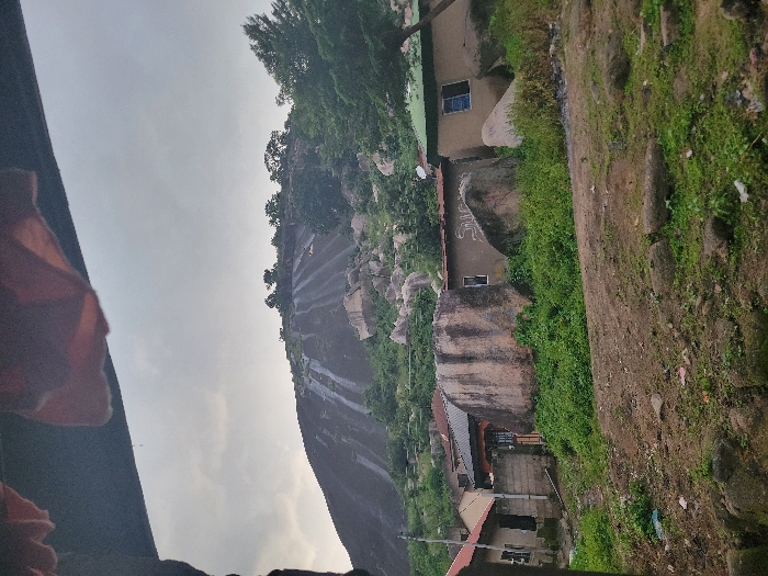 This image captures a landscape in Madalla, Nigeria. The dominant feature is a large, grey, steep rock formation in the background, exhibiting numerous vertical streaks consistent with water erosion. Trees and various green vegetation are sparsely distributed on the rock face and densely at its summit. At the base and mid-levels of the rock, multiple single-story residential structures are visible. These buildings feature roofs in shades of reddish-brown and green, and some appear to be constructed directly against or incorporate large, naturally occurring boulders. One building's exterior wall displays the word "Suez" in white lettering. The foreground consists of uneven ground with exposed soil, scattered rocks, and patches of green grass and foliage. The sky is overcast with light grey clouds. No human subjects are present. A dark, indistinct overhead object partially obstructs the top portion of the frame.