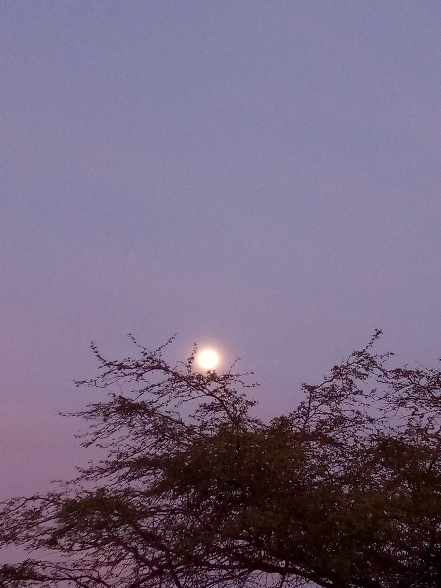 The image depicts a view in El Espinal, Venezuela at dusk. A large, dark tree occupies the lower portion of the frame. The moon, round and bright, shines through the branches of the tree. The sky is a gradient of purple and pink, indicating twilight. There are no people visible in the image.