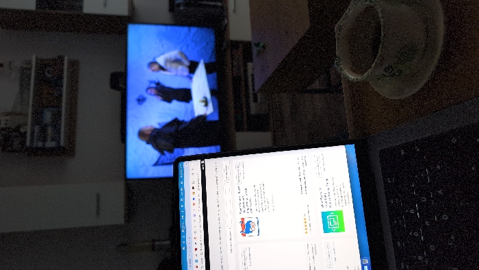 The image depicts an indoor scene, likely a living room or study, situated in Oreshak, Bulgaria, characterized by dim lighting and significant digital noise. In the foreground on the left, an open laptop displays an illuminated screen showing a web page, possibly an application store, featuring an icon of a person with glasses and a calendar, accompanied by text. The dark keyboard of the laptop is partially visible. To the right in the foreground, a cup filled with a dark liquid, presumably coffee, sits on a saucer on a dark wooden table surface; the cup has a faded decorative pattern. In the midground, a large flat-screen television is actively displaying a program or movie. On the screen, three individuals are visible in an outdoor setting with a bright blue background, possibly snow or ice. One individual on the left has their back partially to the viewer, wearing a dark jacket. A second individual in the center, also in a dark jacket, faces left. A third individual on the right, wearing a light-colored jacket, faces towards the center. They appear to be gathered around a light-colored object on a table. In the background, above the television, a wall-mounted shelf holds indistinct objects.