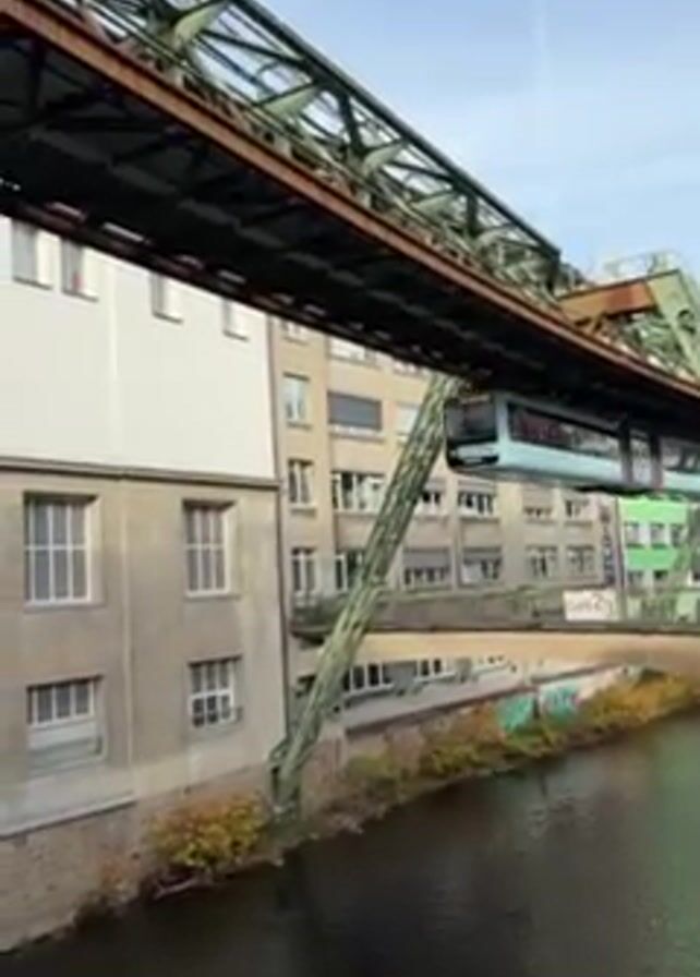- "A light blue suspended monorail travels from right to left on a track above a river flowing through an urban area" by FM-xKTK43, licensed under CC BY 4.0