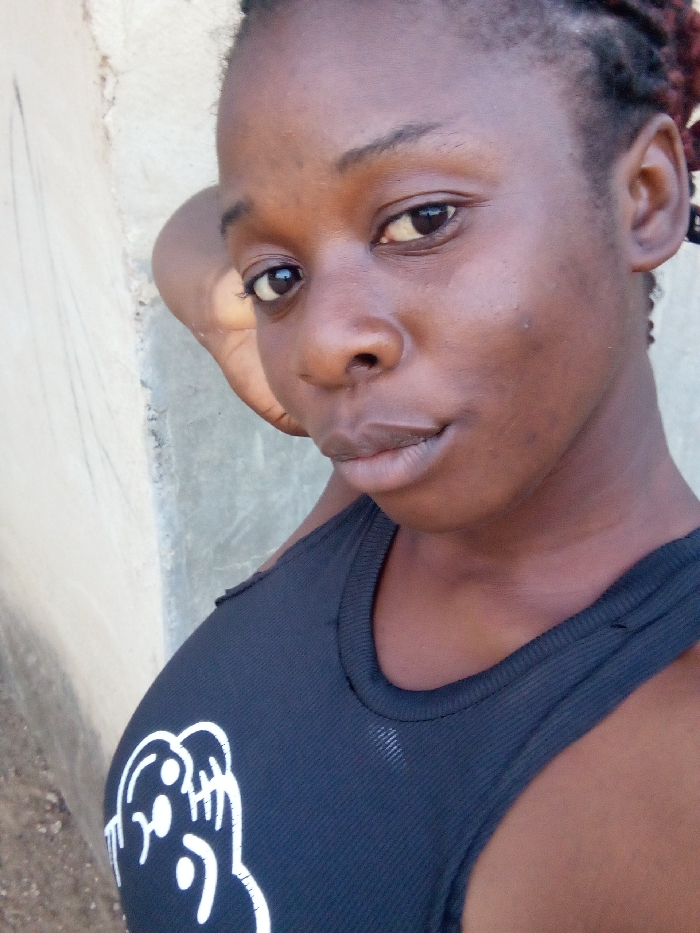 A dark-skinned woman gazes directly at the camera with a neutral expression