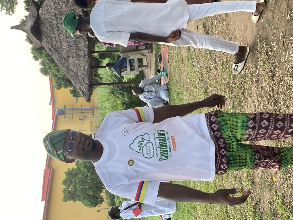 A man in a white T-shirt, green and brown pants, and a striped hat stands in a grassy area. His T-shirt has colorful stripes on the sleeves and a logo with "NYCN LAGOS Coordinators Exchange Retreat OGUN 2018". Several people are seated or standing around him. A small, thatched-roof structure is visible in the background, as is a yellow building. The man wears glasses and has a slight smile.