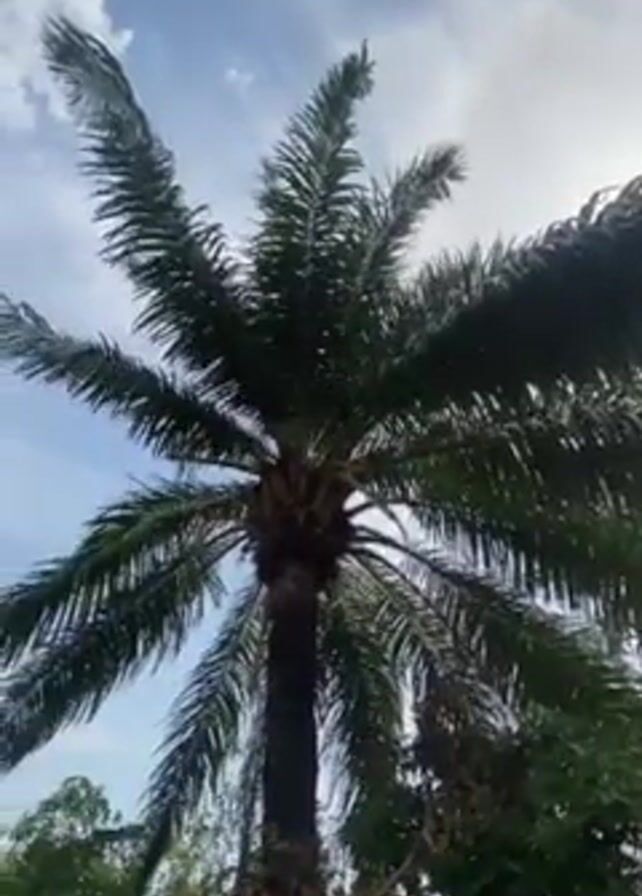palm tree from a low angle, with the sky in the background. The tree's leaves are swaying in the wind. The sky is partially cloudy, with the sun shining through the clouds. There are some green shrubs in the lower right corner. The speaker says "because you all got to move".