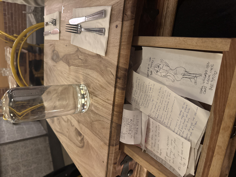 A wooden table hosts silverware, a water glass, and an open drawer overflowing with paper slips. A receipt from "LOLA ROSA" dated January 7, 2026, displays "CAESAR SALAD" and "HEMPBURGER". Scrawled notes discuss returning to school, becoming a nurse, Montreal, and empathy. One note features a drawing labeled "PORTRAIT OF THE DOG" with a human-like female body, next to the words "STAY VEGAN YOU CAN LOOK LIKE ME". Some notes are in French.