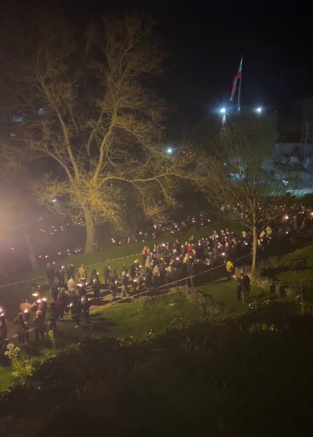 At night, a large crowd of people holding torches, or lights, are gathered outdoors