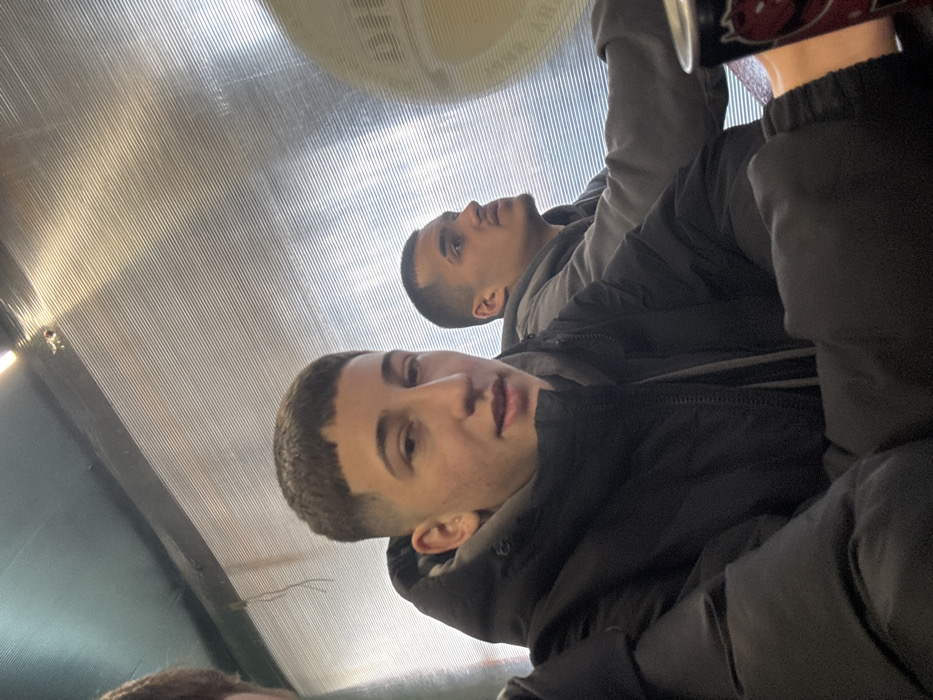 The scene is situated in the city of Devin, Bulgaria. The image captures two young males and a partial third individual within an indoor or semi-enclosed environment. In the foreground, positioned towards the left, a young male with light skin features short, dark hair styled with a fade and a blunt fringe. He is wearing a black puffer jacket over a grey hooded sweatshirt. His eyes are directed towards the camera, and his mouth is slightly open. His left forearm and hand are visible in the lower left, resting on an unseen surface. Behind and to the right, a second young male with darker skin and short, dark hair is visible from the chest up. He is wearing a grey hooded sweatshirt and looking upwards and to his right, away from the camera's perspective. A small, out-of-focus segment of a third individual's head and hair is visible in the far top-left corner. A red and black beverage can, featuring an indistinct logo, is partially discernible in the bottom right quadrant. The background comprises a translucent panel with horizontal ribs or fluting, through which diffused light is visible. A linear light fixture is mounted overhead at the top of the frame.