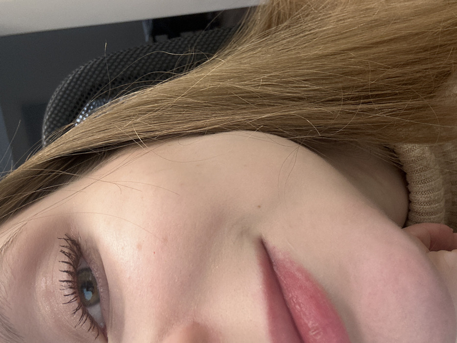 A close-up, tilted view of a fair-skinned person's face. Focus is on the left eye with visible mascara. Blonde hair falls across the forehead. A partial view of full, pink lips is seen. A black mesh chair and a beige knit garment are visible in the background, adding context to the selfie. The composition highlights facial features and textures.