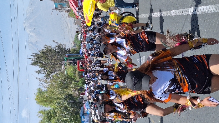 A vibrant street parade showcases participants in matching athletic wear with colorful embellishments. Some hold phones while others dance. A person in a wheelchair follows behind, adorned with a bright yellow canopy. A mountain rises in the background of the procession along a tree-lined street, while power lines stretch across the sky. The parade is densely packed and viewed by many onlookers.