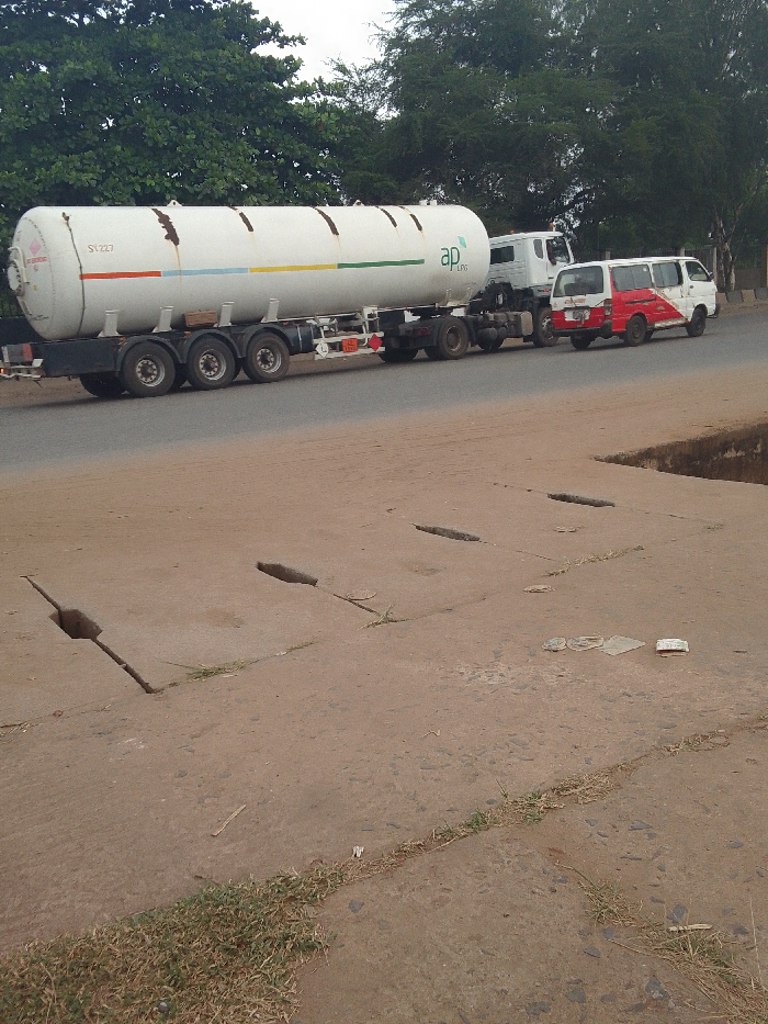 An LPG tanker with a white tank and “ap LNG” branding is on a road with a semi-truck and a red and white van. The scene includes a concrete drainage ditch with rectangular slots and some grass growing along the edges. Trees are visible in the background, contributing to a natural, outdoor setting.