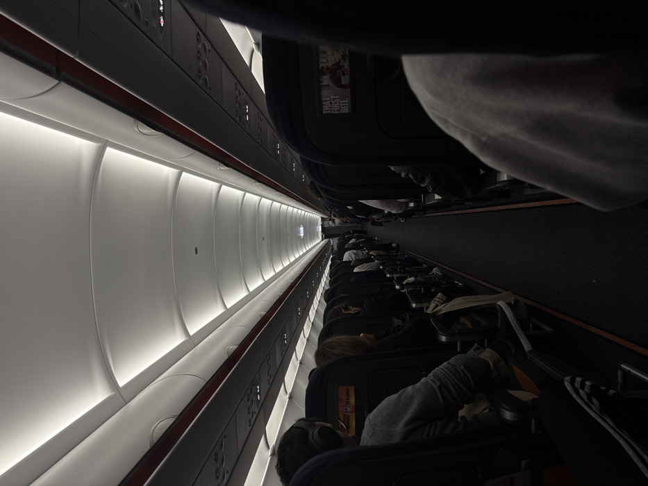 - "The image depicts the interior of a commercial aircraft cabin, viewed from a passenger's seat looking forward down a central aisle" by FM-euyLP2, licensed under CC BY 4.0
