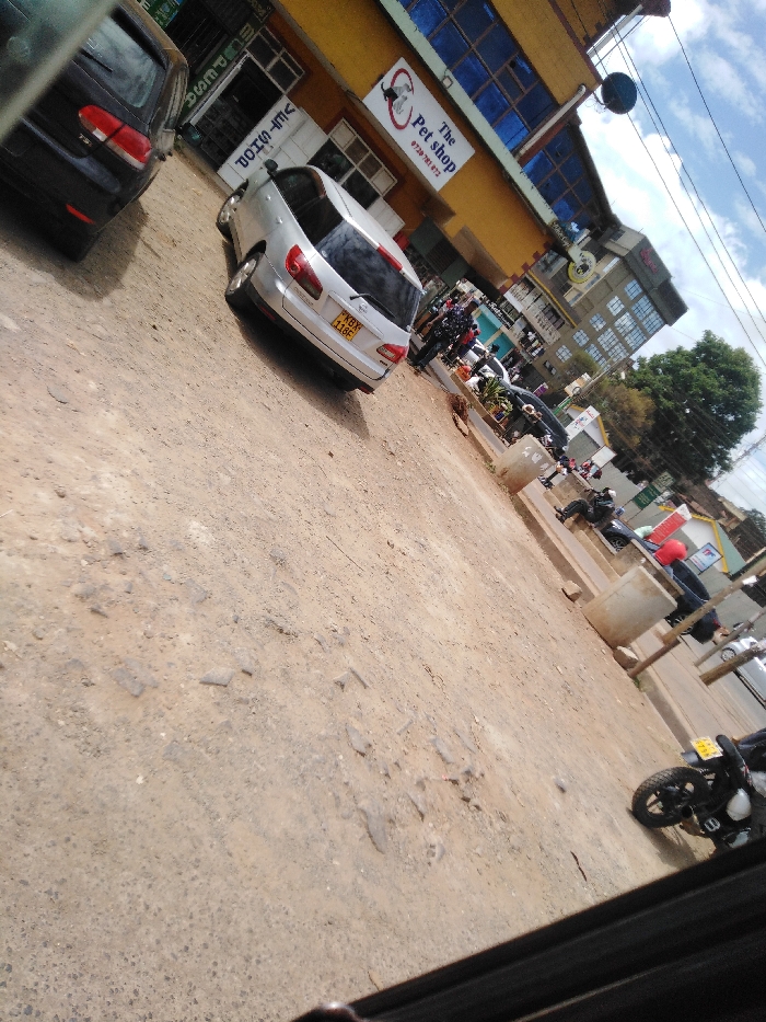 The image depicts an unpaved, dusty urban street scene in Kikuyu Township ward, Kenya, captured from a tilted, slightly downward perspective, seemingly from within a vehicle