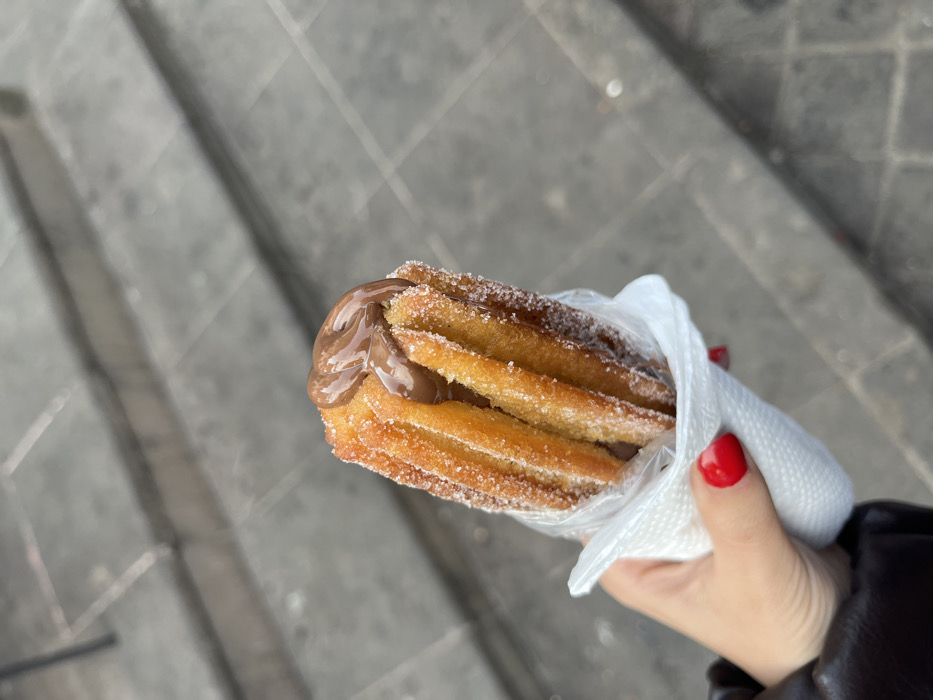 - "A hand with red nail polish holds a churro filled with chocolate" by FM-u1XXD2, licensed under CC BY 4.0