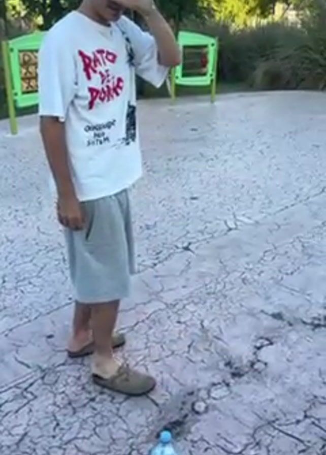 A young man stands outdoors in a cracked concrete area, wearing a white t-shirt with the words “Rato De Poro” on it, gray shorts, and tan Birkenstock sandals. He has his eyes covered with one hand. In front of him on the ground is a bottle of water. He attempts to kick the bottle of water with his foot. Behind him is a green playground structure, trees, and other greenery.