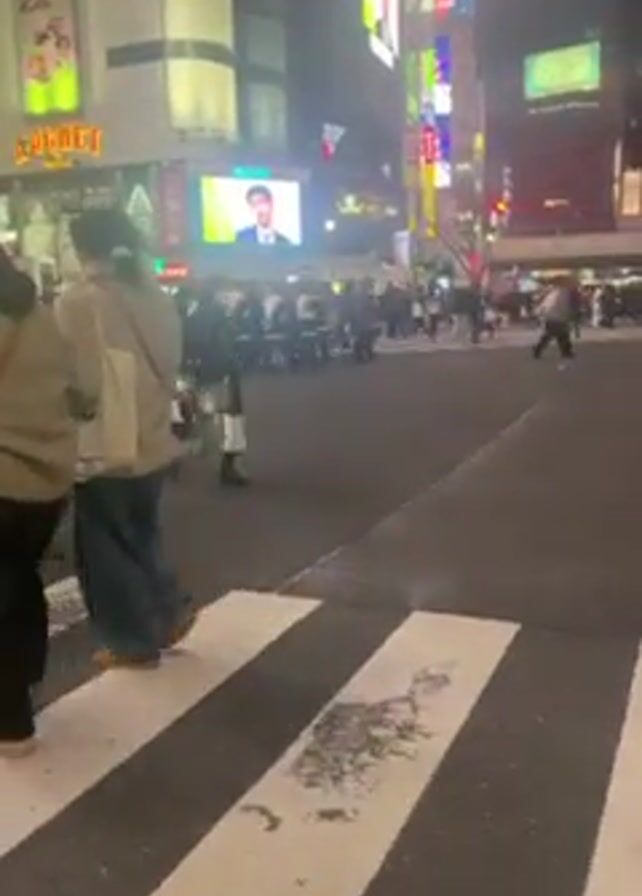 pedestrians walking across a crosswalk at night in what appears to be a busy urban area. Large digital billboards with advertisements are visible on the buildings in the background. The crosswalk is painted white, and there are several people crossing at the same time, some moving faster than others. The lighting is bright, due to the illuminated advertisements and streetlights. The overall atmosphere seems lively and bustling.