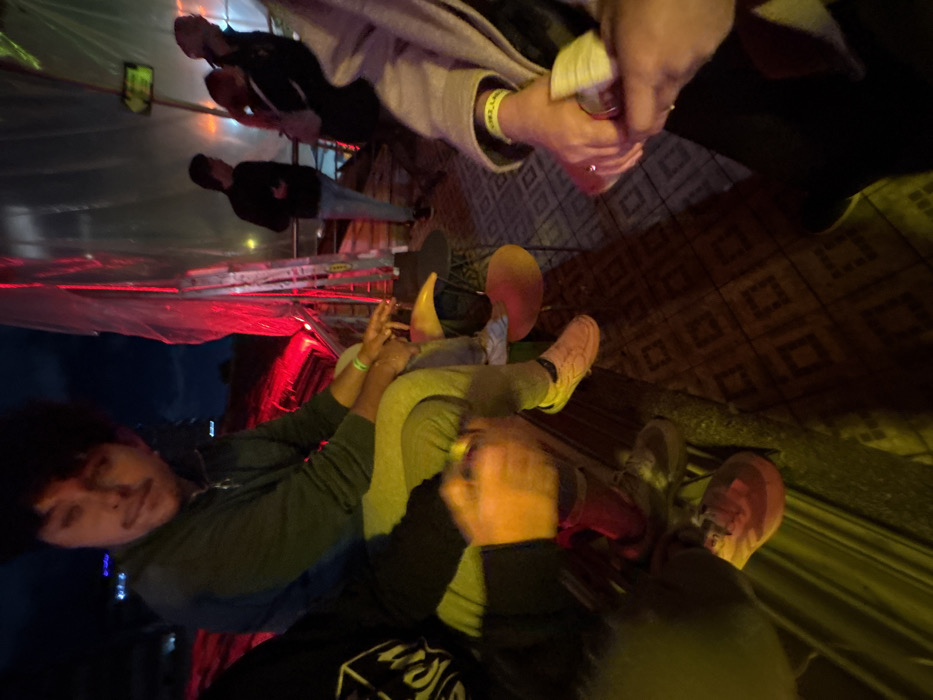 A group of people stand on a patterned floor in a brightly lit space, possibly an event or party. Several individuals are visible, including a person with dark hair wearing a green shirt and light-colored pants. One person holds a drink, wearing a tan coat and a yellow wristband. Red and blue lights are visible in the background, with additional figures standing near a railing. The angle suggests the picture was taken from a low perspective looking upwards.