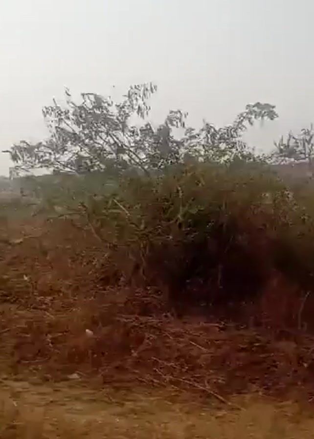 dry, rural landscape. There are scattered bushes, dry grass, and dirt, with a few small, simple buildings in the distance. One structure appears to be a shack constructed of corrugated metal or wood. There's a utility pole visible, and in the distance, high-voltage transmission towers are seen on a small hill. The sky is overcast or hazy. The camera appears to be moving along a dirt road, judging by the changing perspective of the landscape. The sound of an engine suggests the camera is mounted on a vehicle.