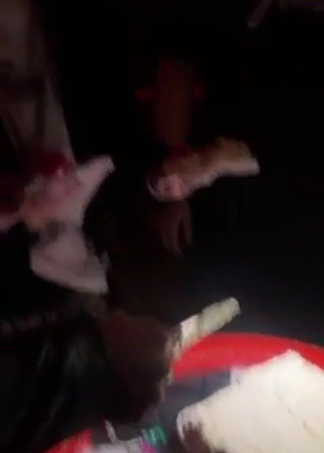 group of young people eating cake outdoors at night. Someone is cutting slices of a large, rectangular cake with white frosting on a red plastic tray, offering them to others. One person is holding a lollipop. Other people stand around talking and drinking beer. Red lighting is visible.