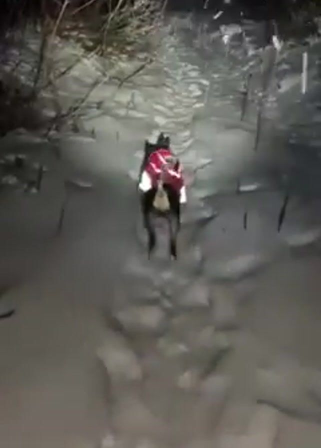 At night, a dog wearing a red and white reflective jacket traverses a snow-covered path. The dog is brown and black and trots along a narrow trail illuminated by a bright, handheld light. The surrounding environment is dark with snow-covered shrubs and trees along the edges of the path. It appears to be snowing lightly. The dog walks off the path towards a snow mound. The handheld light is pointed directly at the dog.