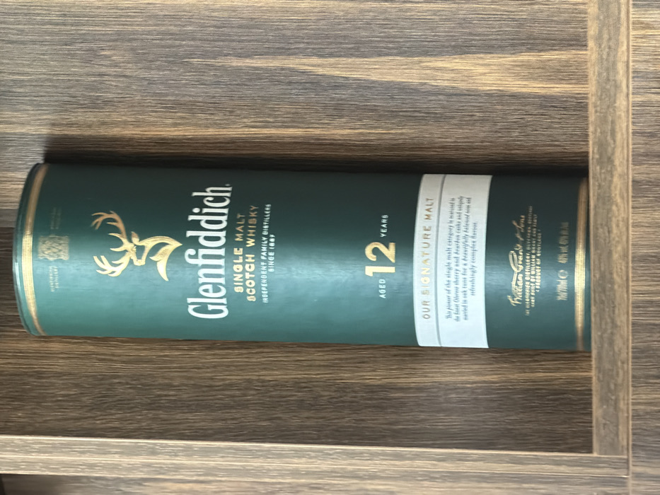 - "The scene depicts a single Glenfiddich Single Malt Scotch Whisky Aged 12 Years presentation tube positioned upright within a wooden shelving unit" by FM-39vED3, licensed under CC BY 4.0