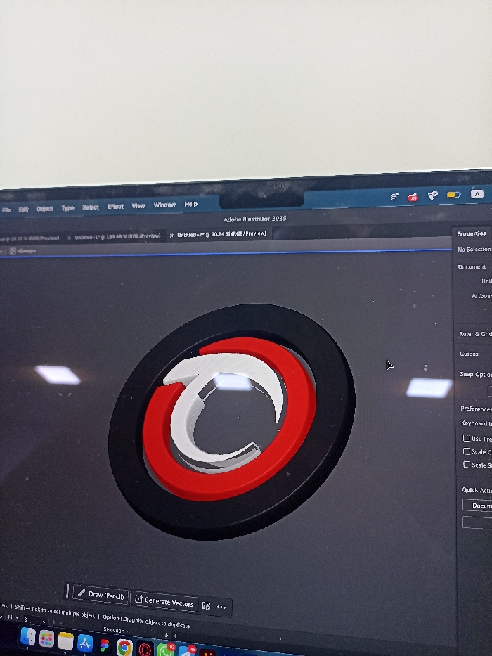 This image depicts an indoor scene within the Al-Qanawat Municipality, Syria, focused on a computer monitor. The monitor displays Adobe Illustrator 2025, presenting a graphic design project. The central element on the screen is a 3D-rendered logo composed of a black circular base. Within this base, a red, extruded C-shaped element is positioned behind a slightly rotated, white/light gray, extruded C-shaped element, creating a layered effect. The screen shows reflections of rectangular overhead lights. The top bezel of the monitor appears smudged or dusty. The lower portion of the screen displays a macOS dock with various application icons, including some with notification badges, and Adobe Illustrator's user interface elements such as "Draw (Pencil)" and "Generate Vectors" buttons, alongside "Properties" and "Guides" panels on the right. The background directly above the monitor is a plain, light-colored wall. No individuals are visible in the image.