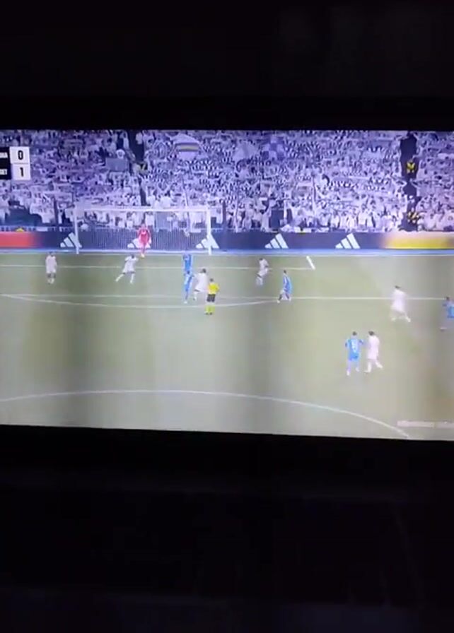 A TV screen shows a soccer game with players wearing white and light blue uniforms on a green field. The players are positioned around the penalty box in front of a goal. The score on the screen shows “0-1”. A large crowd wearing white fills the stands behind the goal. The screen is dark except for the bright image of the soccer game. The surface on which the TV sits appears to be a dark-colored laptop.