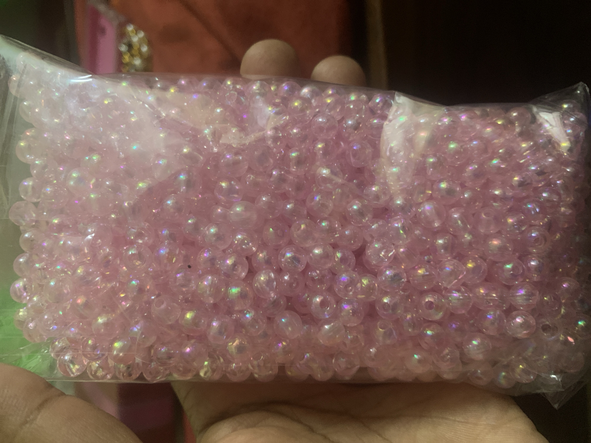 A clear plastic bag filled with numerous small, round, pinkish beads sits in the palm of a human hand. Two fingers are visible on the top of the bag. The beads appear to be translucent and possibly iridescent. The background is dark and out of focus. There is no information in the image to determine the location in the city of Dar es-Salaam, Tanzania.