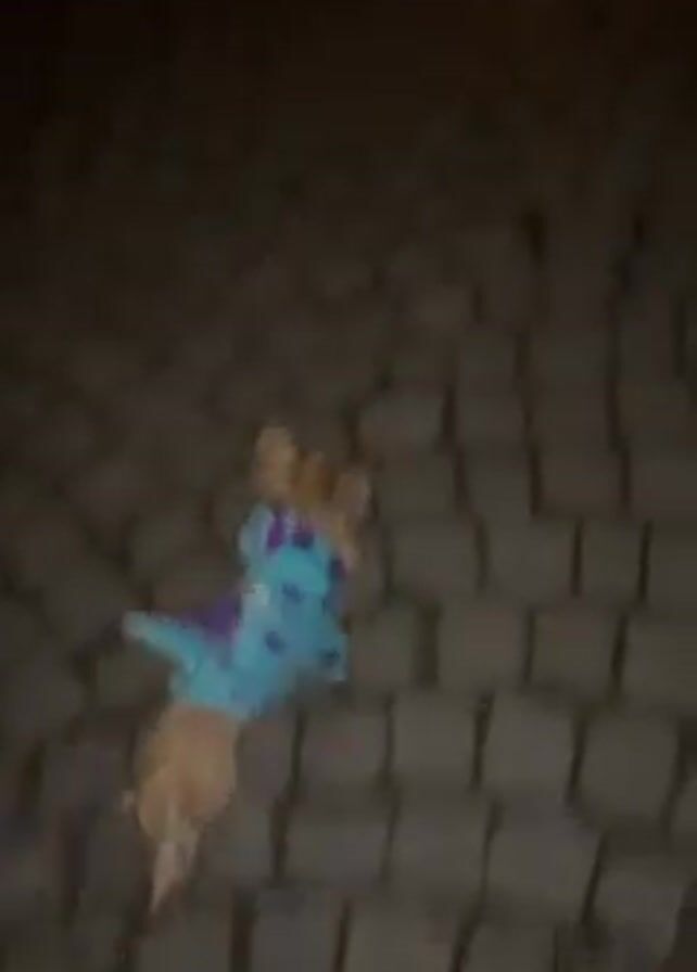 A small, tan dog wearing a blue and purple spotted outfit and a leash is being walked on a cobblestone path at night