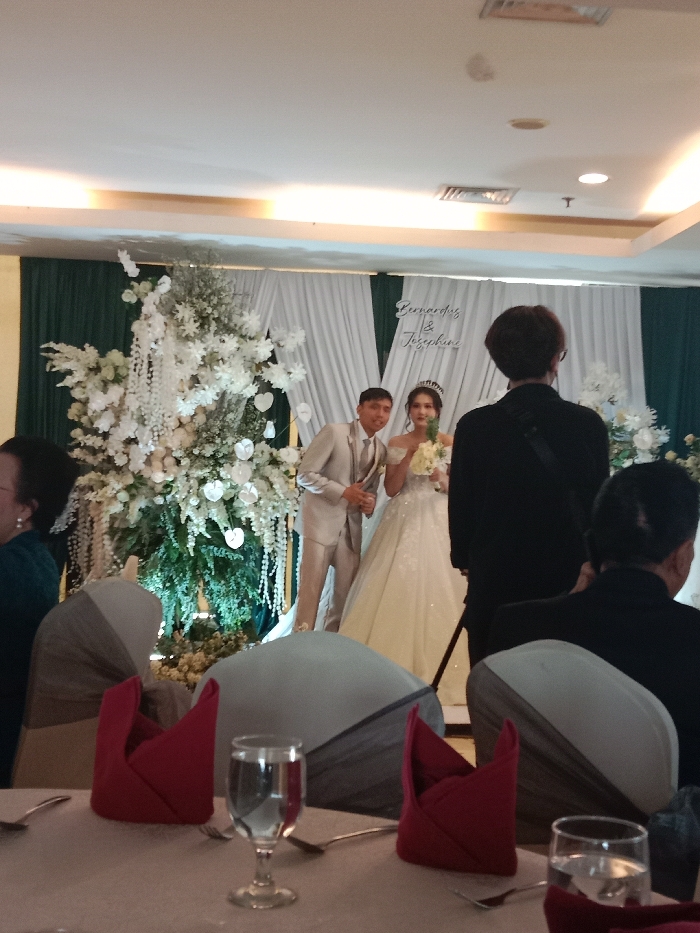 - "A wedding reception is in progress with a bride and groom standing near a backdrop with white and green fabric" by FM-xHTx62, licensed under CC BY 4.0