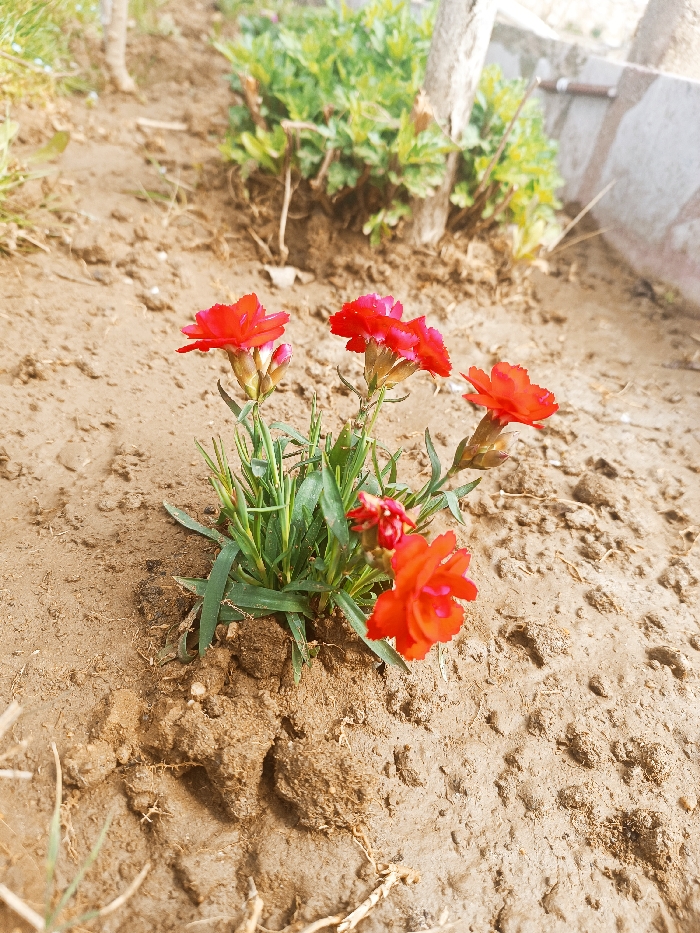 The image depicts a small cluster of flowering plants rooted in dry, light brown soil in Kulata, Bulgaria. The central subject is a perennial plant with vibrant green, slender leaves, supporting six open flowers and three unopened buds. The flowers are a vivid red-orange, each displaying multiple serrated petals. The surrounding ground consists of compacted, light brown earth with scattered small clods. In the blurred background, to the left of the plant, an upright light-colored post or tree trunk is partially visible. Behind the flowers and extending to the right, a mass of green leafy vegetation is present, followed by a light-colored concrete structure or wall exhibiting faint vertical details. No individuals or animals are present. The scene is illuminated by natural daylight.