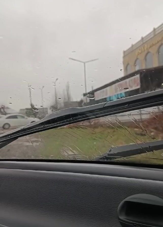 The view from inside a car shows a gray, rainy day through the windshield