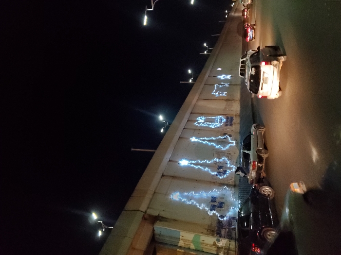 A low-angle, long-shot image at night showcases a concrete overpass adorned with Christmas lights fashioned into star and tree shapes