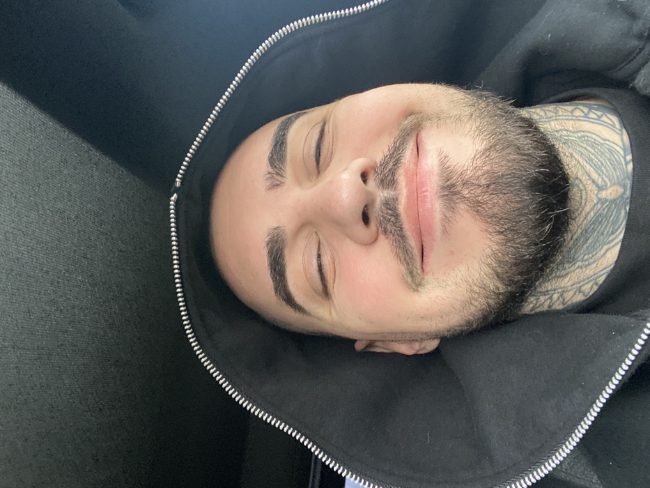 A male individual is depicted in a close-up, head-and-shoulders portrait. He possesses light skin, dark hair, pronounced dark eyebrows, and a beard and mustache. His eyes are closed or squinted, and his mouth is curved in a subtle smile. He is wearing a black hooded garment, possibly a jacket or sweatshirt, with a visible silver zipper running vertically on the right side of the frame. Intricate, dark-inked tattoos are prominently displayed on his neck, extending downwards. The background consists of a dark, indistinct, textured surface, likely the upholstered ceiling or interior lining of a vehicle or confined space. There are no discernible features to indicate a specific location within the city of Lyaskovets, Bulgaria. The image appears to be a selfie, taken from a slightly low angle looking upwards at the subject.