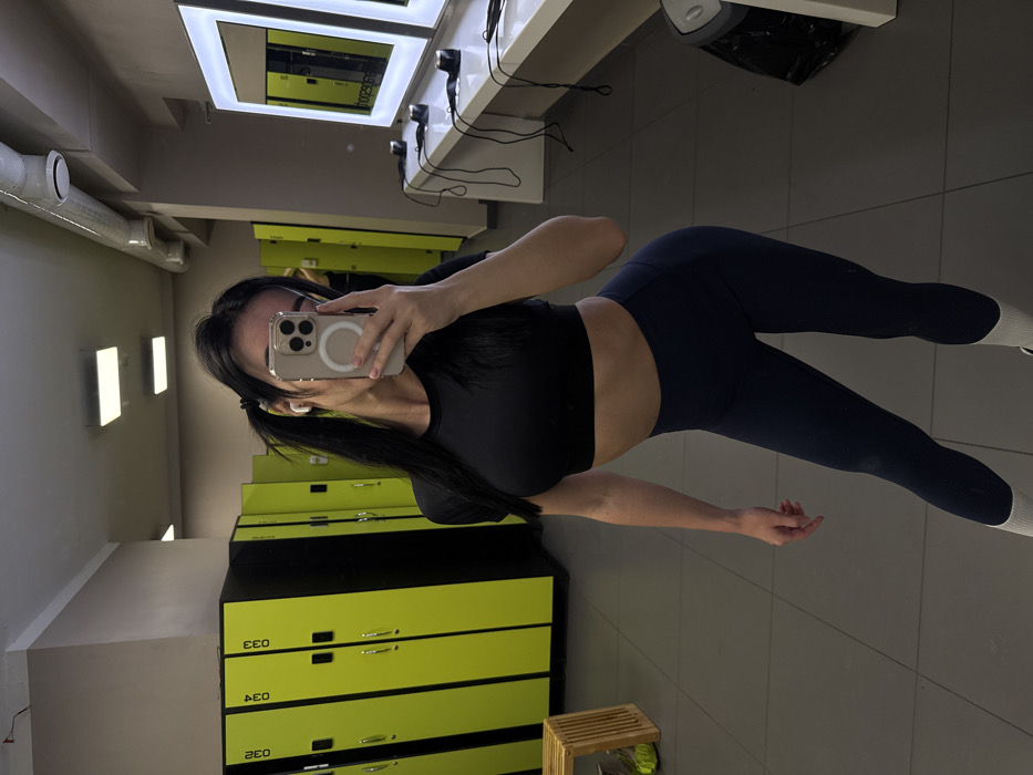The image depicts an adult female posing for a mirror selfie inside what appears to be a modern gym changing room or locker room