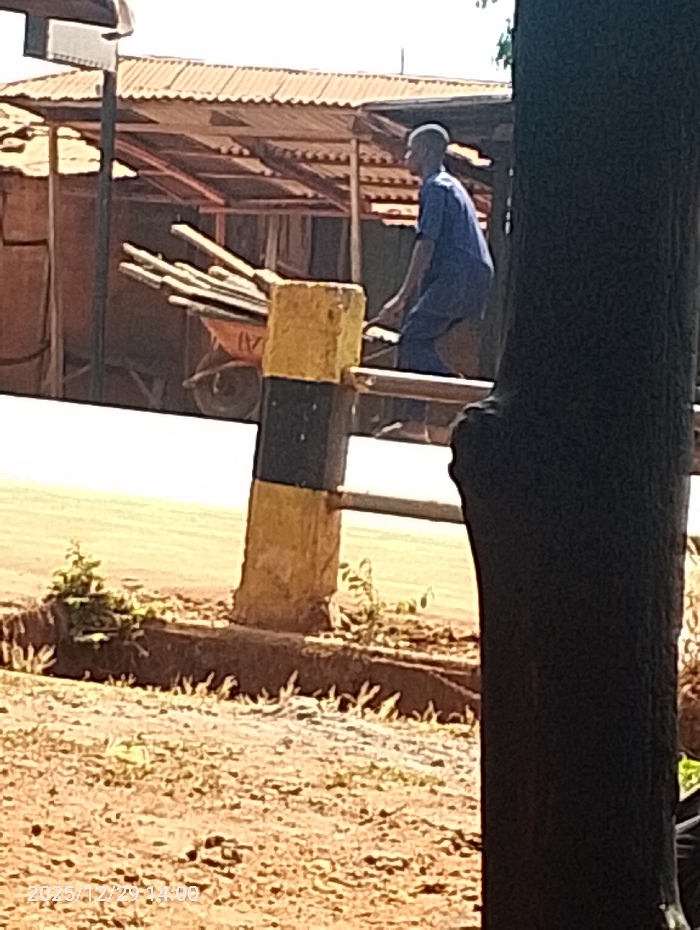 This image, captured on December 29, 2023, at 14:00, depicts an outdoor scene in Ejule, Nigeria. In the mid-ground, a dark-skinned adult male with short hair, wearing a blue short-sleeved uniform and trousers, is positioned to the right of the frame, facing left. He is in a bent-over posture, actively engaged with an orange wheelbarrow filled with multiple light-colored wooden planks or beams. The wheelbarrow is situated behind a black and yellow striped concrete barrier or bollard in the foreground, from which a metal rail extends horizontally. To the far right, a large dark tree trunk partially obscures the view. The immediate foreground consists of reddish-brown earth with sparse green vegetation and small plants. Behind the concrete barrier and the man, a paved surface or road is visible. In the background, several structures with corrugated metal roofs and visible wooden framing are present, suggesting market stalls or workshops. The scene is brightly lit by daylight, indicating clear weather.