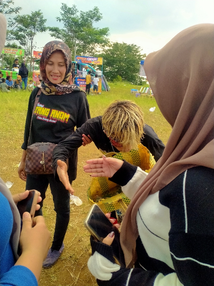The image depicts an outdoor scene in Sidomukti, Indonesia, characterized by a grassy field with patches of exposed soil, indicative of an event or gathering. The background features several trees under an overcast sky, with two vendor stalls visible: one with a green sign marked "CORN DOG" and another blue and yellow stall displaying "JAGUNG CHEESE TARIK" on multiple banners. Scattered groups of individuals, including adults and children, are present in the distant background. In the mid-ground, three individuals are engaged in an interaction. A woman of apparent Indonesian ethnicity, positioned center-left, is smiling and looking slightly to her left. She wears a dark patterned hijab, a black long-sleeved shirt with yellow/orange text reading "TANG ANOM / Tekno Balap Jenggel," black pants, and purple flat shoes. A brown shoulder bag with a checkered pattern (resembling Louis Vuitton monogram) and a gold chain hangs across her body. Her right arm is extended forward with an open palm. To her immediate right, a person with bleached blonde, spiky hair is bent forward, looking downwards. This individual wears a black long-sleeved shirt and a yellow and green patterned garment around their lower body. The smiling woman's left hand is placed on this person's right arm, providing support. The blonde-haired person's right hand is also extended forward with an open palm. In the foreground, two individuals are partially visible, holding smartphones. On the far left, a person wearing a blue top holds a dark smartphone horizontally with both hands. On the far right, a person visible from the back/side wears a brown hijab and a black and white patterned long-sleeved top. This individual holds a light-colored smartphone in their right hand, revealing dark red polished nails, and their right arm is extended with an open palm towards the blonde-haired individual. Several white plastic bags are scattered on the ground.