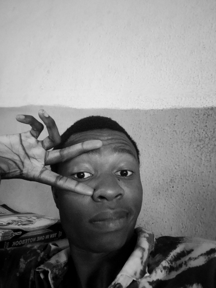 The image, rendered in black and white, depicts an individual, likely male, positioned in an indoor setting within the City of Unknown, Unknown. The subject, seen from the chest up, has short, dark hair and is looking directly at the camera with dark eyes and a slightly open mouth. Their left hand is raised, forming a "peace sign" (V-shape with index and middle fingers) which partially obscures the left side of their face, near the eye and nose. The ring and pinky fingers are curled. The individual wears a patterned shirt with areas of light and dark contrast. The background consists of a wall, horizontally bisected. The upper portion is lighter and appears to have a subtle texture, while the lower portion is darker and more noticeably textured. A distinct horizontal line separates these two wall sections. To the left of the subject, behind their shoulder, a stack of items resembling notebooks is visible, with the word "NOTEBOOK" identifiable in reverse on one. Lighting appears to be frontal, casting minor shadows.