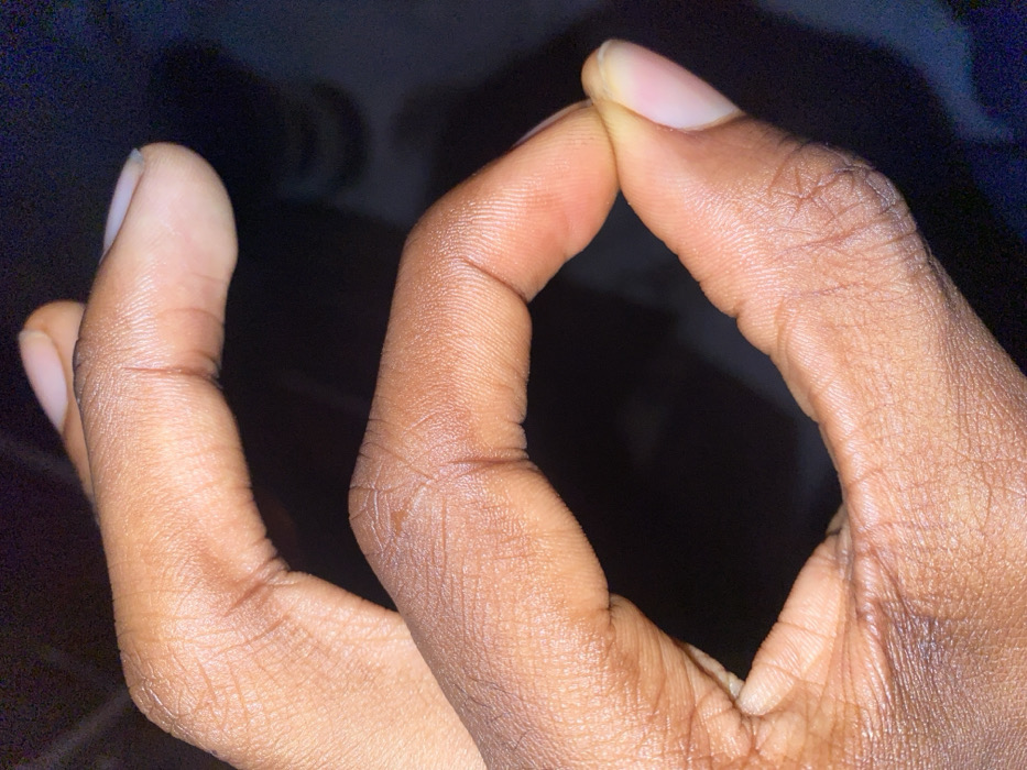 A close-up photograph captures a human hand, exhibiting medium to dark brown skin tone, performing a gesture commonly known as "OK" or "A-OK