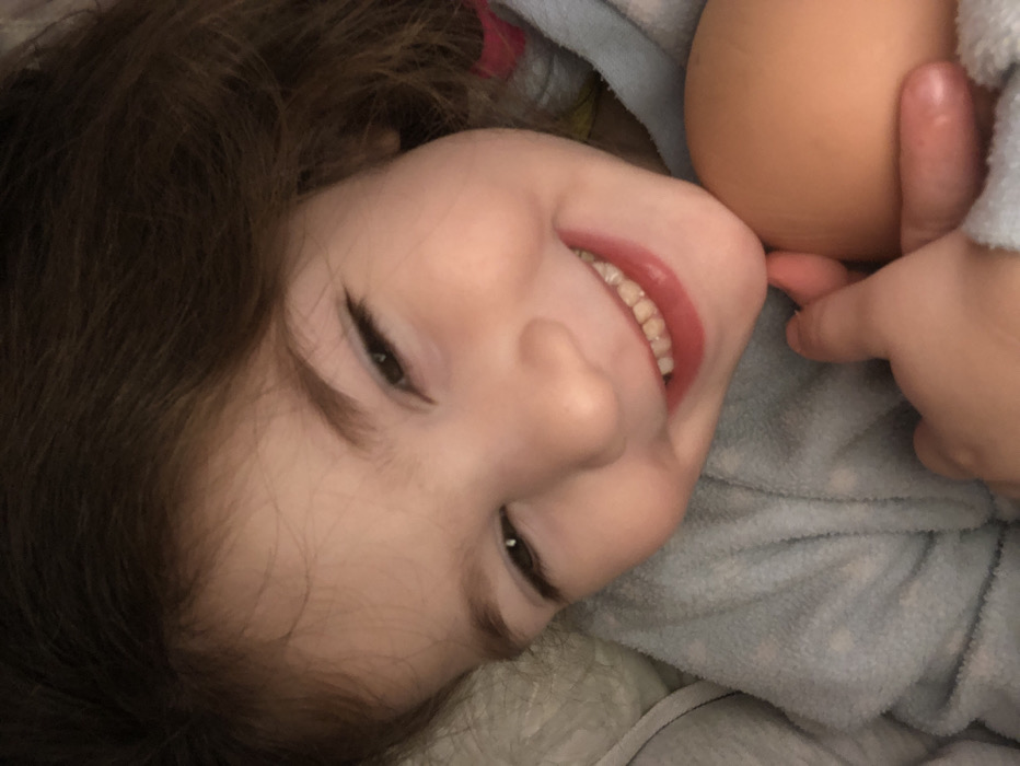 This image depicts a close-up, portrait-oriented view of a young child, located in Saverne, France. The child has fair skin, dark brown hair, and dark eyes, with an expression characterized by a wide smile revealing upper and lower teeth, and partially closed eyes. The child is wearing a light blue, soft-textured garment, patterned with small white dots. A child's hand is visible in the lower right portion of the frame, gently resting on or holding a smooth, light brown, ovoid object, which appears to be a doll's head or a similar toy. The scene suggests an indoor, intimate setting.
