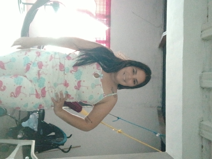 A single adult female is depicted standing centrally in an indoor residential setting in Juan Griego, Venezuela. The woman has long dark hair, a smiling expression, and is looking directly at the viewer. She is wearing a light-colored, two-piece pajama set patterned with pink flamingos and light blue cloud shapes; the top is a camisole with thin straps and a small keyhole cutout. A tattoo is visible on her upper left arm. Her right hand rests on her hip. The background features light-colored walls and a ceiling with exposed, light-colored beams. Strong backlighting originates from the left side, partially obscuring a light source, possibly a window with pink sheer curtains, and a dark, partially visible circular object in the lower left. To the right of the subject, a dark-colored baby stroller is visible, along with a partial view of a white chair. A blue and yellow rope or cord hangs from the ceiling in the upper right quadrant of the image.