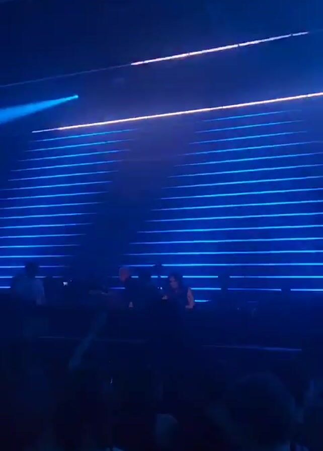 dimly lit nightclub scene. A crowd of people is visible in the foreground, facing a raised stage where two people appear to be performing or DJing. The stage is decorated with horizontal neon blue lines, resembling steps, lit up from behind. Blue spotlights shine from above, adding to the club atmosphere. People in the crowd are waving their arms and seemingly enjoying the music. The overall mood is vibrant and energetic.