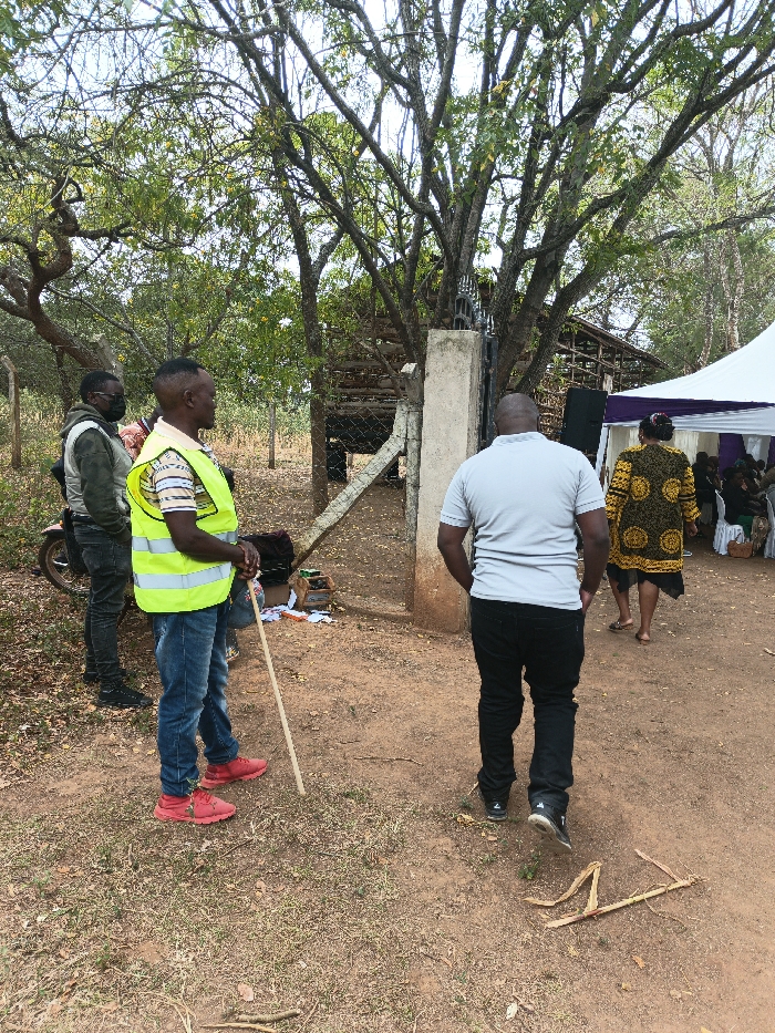 Four people stand outside a gated area. One wears a neon vest and holds a stick, another a mask, and a third a gray shirt. The fourth person, wearing a yellow and black patterned dress, walks toward a tent. A motorcycle is parked nearby. The area appears to be rural, with trees and a simple structure visible through the gate.