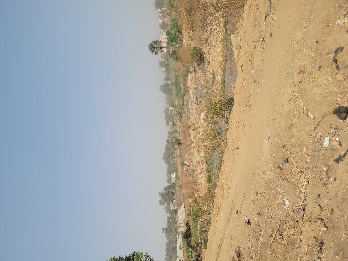 The image captures an expansive, dry landscape in Rafin Par, Nigeria, under a pale blue sky. The foreground consists of uneven, light brown dirt mixed with scattered debris, including small pieces of trash and dark organic matter. The terrain descends into a midground depression, revealing a shallow body of water with exposed banks, indicative of a riverbed or stream during a dry period. Sparse, dry, and some green scrub vegetation borders the water and surrounding areas. In the distant background, a residential area is visible, characterized by numerous low-rise buildings with light-colored roofs, interspersed with trees. A distinct tall, palm-like tree stands prominently on the right side of the distant horizon. No individuals are present.