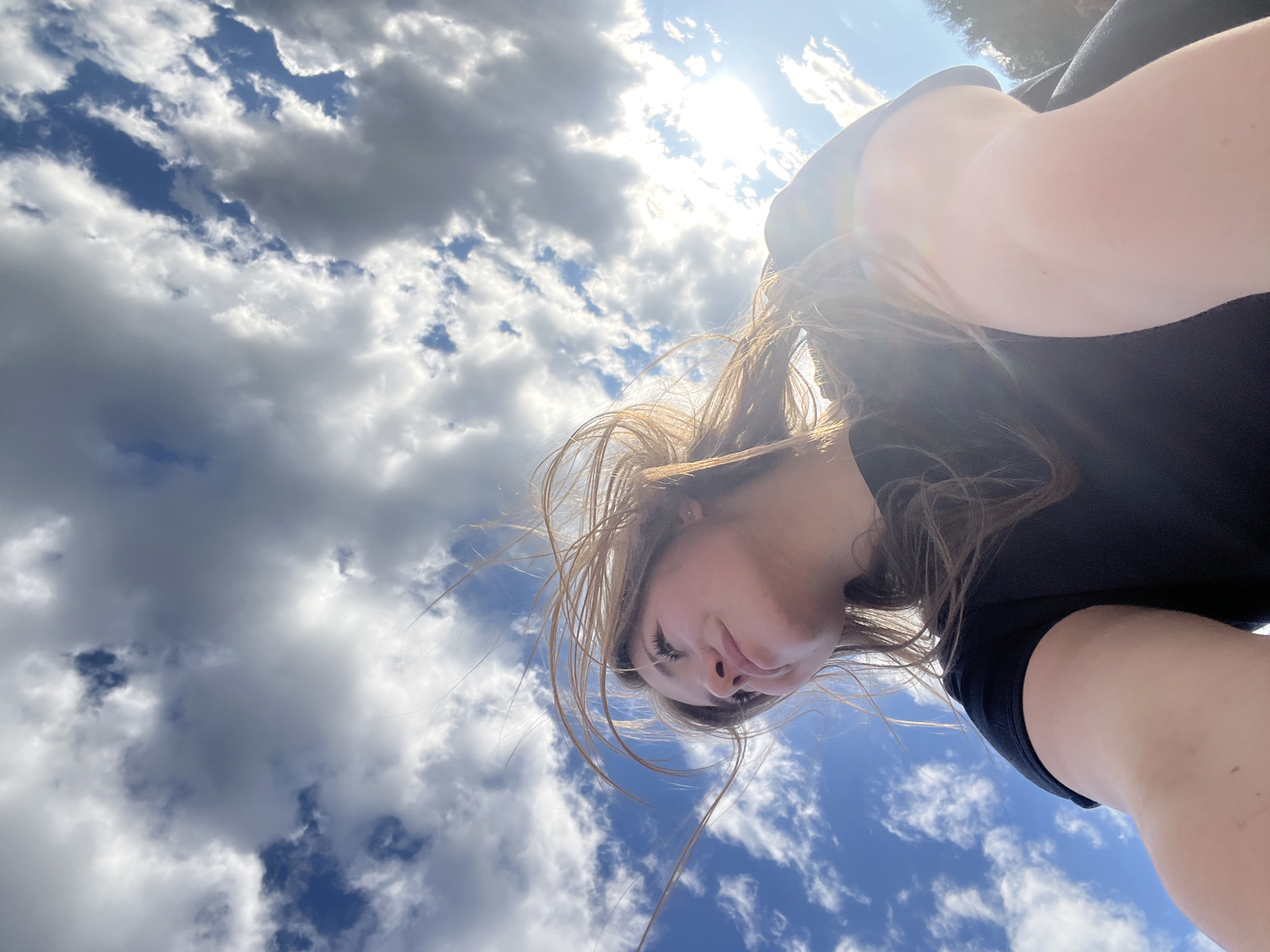 A low-angle outdoor photograph captures a young female subject looking upwards against a partly cloudy blue sky in Đuraševići, Montenegro. The subject is positioned in the lower frame, shown in profile with her gaze directed towards the upper left. Her light-colored, long hair is disheveled and appears elevated, dispersed against the sky as if by wind. She is wearing a dark, short-sleeved top. Her left forearm extends into the lower-left foreground, indicating a self-portrait. The upper right of the sky contains a visible bright sun, creating a significant lens flare and backlighting the subject. The sky exhibits formations of white and gray cumulus clouds interspersed with areas of clear blue. Indistinct dark foliage is minimally present in the extreme lower right background.