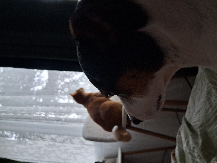 The image displays an indoor scene, likely a residential space in Varna, Bulgaria. In the immediate foreground, positioned on the right, the head and neck of a dog are visible in profile. The dog has white fur with dark black and tan markings around its head and ears, and its snout is directed towards the left. In the mid-ground, an orange domestic cat is seated on a light-colored chair, positioned in front of a window. The cat's back is to the viewer, and it faces outwards, looking through the window. The window is covered by a sheer white lace curtain, and through the transparent fabric, blurred tree branches or foliage are discernible, suggesting an outdoor natural environment. A dark curtain hangs to the right of the window. In the lower left quadrant of the foreground, a green-patterned blanket or bedding is visible. To the left of the chair, the wooden legs of another piece of furniture are partially visible. The lighting is moderate, with light originating primarily from the window.