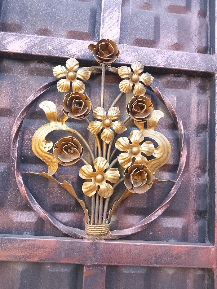 A close-up shows a metal floral arrangement affixed to a gate or door. The design features roses and five-petaled flowers in gold, encircled by a twisted metal ring. The arrangement appears to be held together at the bottom, mimicking a bouquet in a vase. The background shows a weathered, painted metal surface, with a grid pattern suggesting paneling. The color palette is dominated by gold and shades of brown.