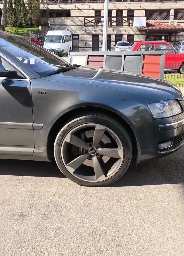 dark grey Audi A8 parked on a paved road. The car is slightly dirty and has aftermarket wheels. In the background, there is a building with a distinctive architectural style, with white and brown accents. Several other cars and a white van are parked in the background as well. Trees are visible in the distance, and the weather appears to be sunny. The camera slowly pans from the front of the car towards the back, showing the car's profile.